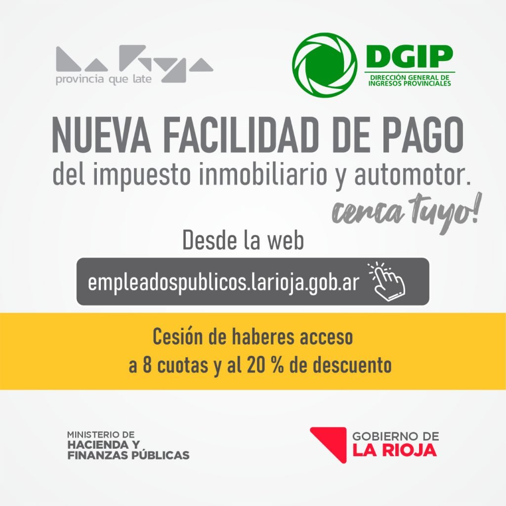 El Ministerio de Hacienda y Finanzas públicas a través de la Dirección de Ingresos Provinciales informan acerca de la nueva facilidad de adhesión por cesión de haberes para el Impuesto inmobiliario y automotor desde la web empleadospublicos.larioja.gob.ar. La misma está dirigida a las y los empleados públicos y contará con accesos a beneficios en cuotas […]