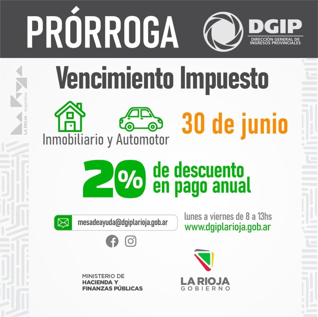 La Dirección General de Ingresos Provinciales comunica que mediante la resolución N°9 se decidió prorrogar el pago anual hasta el 30 de junio, el mismo impacta para los impuestos inmobiliario y automotor, permitiendo acceder a un 20% de descuento. Las y los contribuyentes podrán imprimir el cedulón a través de la web: dgiplarioja.gob.ar.